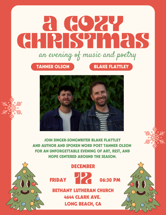 A Cozy Christmas with Tanner Olson & Blake Flattley - Friday, December 12th: Join poet Tanner Olson and songwriter Blake Flattley on Friday, December 12th at 7:00PM for A Cozy Christmas at Bethany Lutheran, Long Beach Campus—an evening of storytelling, poetry, and music to warm your heart this holiday season. Gather with friends, sip something festive, and celebrate hope, joy, and wonder through words and songs that capture the true spirit of Christmas.